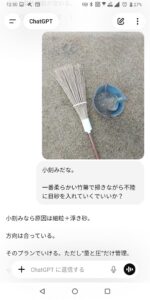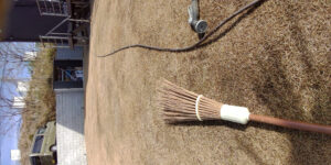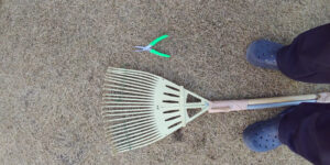 まずは一番柔らかい熊手で軽く撫でながら、掃除しつつ雑草を抜いていく。