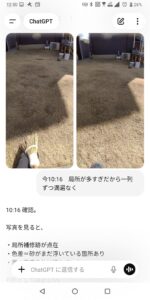 全体俯瞰としては、家庭の芝としてはまあまあだけど、パッティングで転がして遊ぶにはまだまだ程遠い感じ。