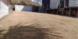 全体俯瞰としては、家庭の芝としてはまあまあだけど、パッティングで転がして遊ぶにはまだまだ程遠い感じ。