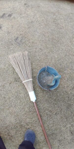 まずは一番柔らかい熊手で軽く撫でながら、掃除しつつ雑草を抜いていく。