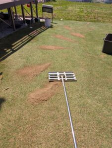 ざっくりと肥料入り目土を入れてレベリングレーキで均していく。